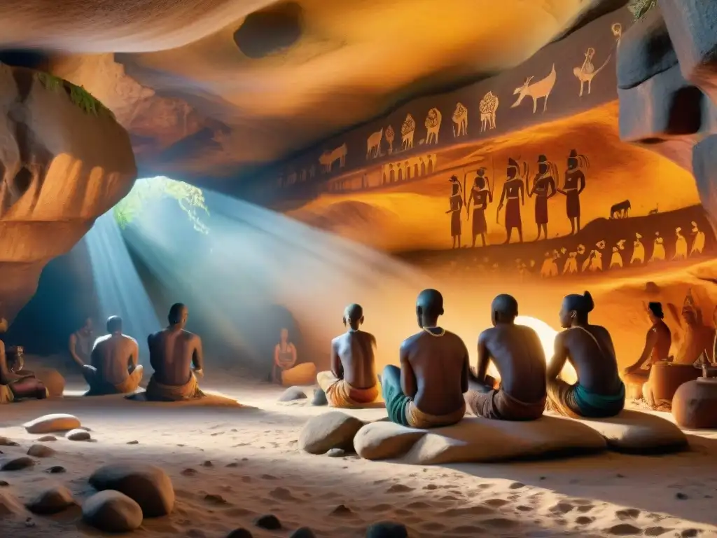 'Arte rupestre San sur África: San pintando detalladas representaciones espirituales en cueva iluminada