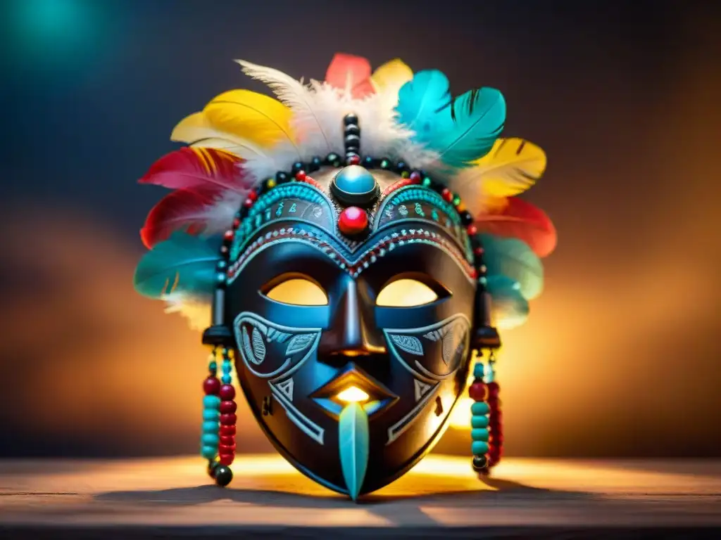 Máscara tallada con detalle, adornada con cuentas y plumas, en mercado africano