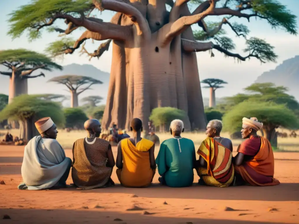 Grupo de ancianos bajo un baobab, vistiendo atuendos tradicionales, en una animada discusión al atardecer africano