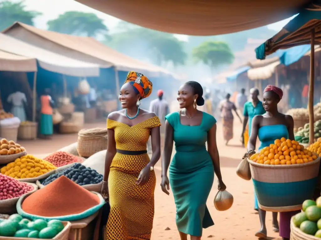 Un vibrante mercado africano donde mujeres lideran intercambios comerciales